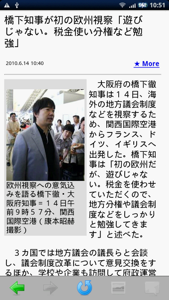 ギュー・ニュースを起動すると、ニュースサイトが一覧表示されます。さっそく、読みたいサイトをタップしてニュース記事を受信しましょう。ニュース記事はタイトルと全文、さらには写真まで表示されます。見出しの星印をタップしてブックマークを付ければ、後で読み返すこともでき便利です。「沢山の記事を流し読みしながら、気になった記事だけを後でじっくり読みたい」という時に役に立つでしょう。